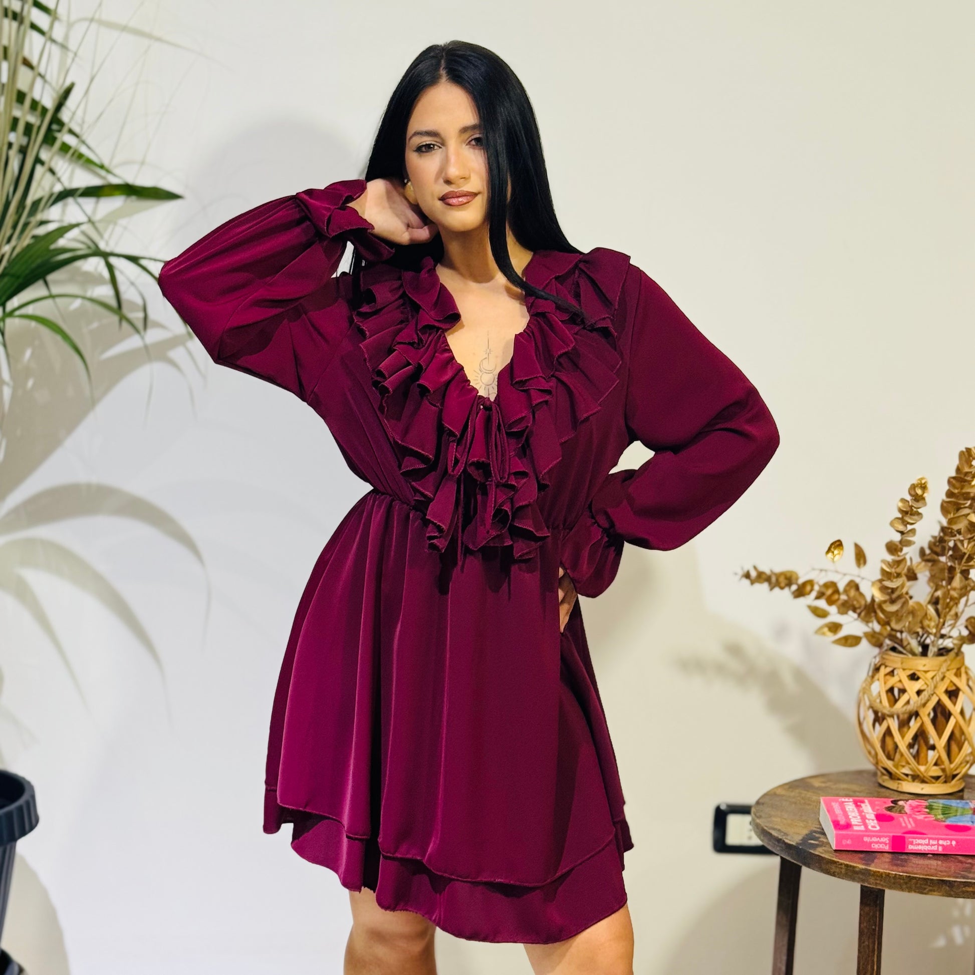 Abito corto in tono bordeaux vino, con scollatura arricciata e balze romantiche sul davanti. Morbido, leggero, super femminile. Modellante su seno e punto vita.