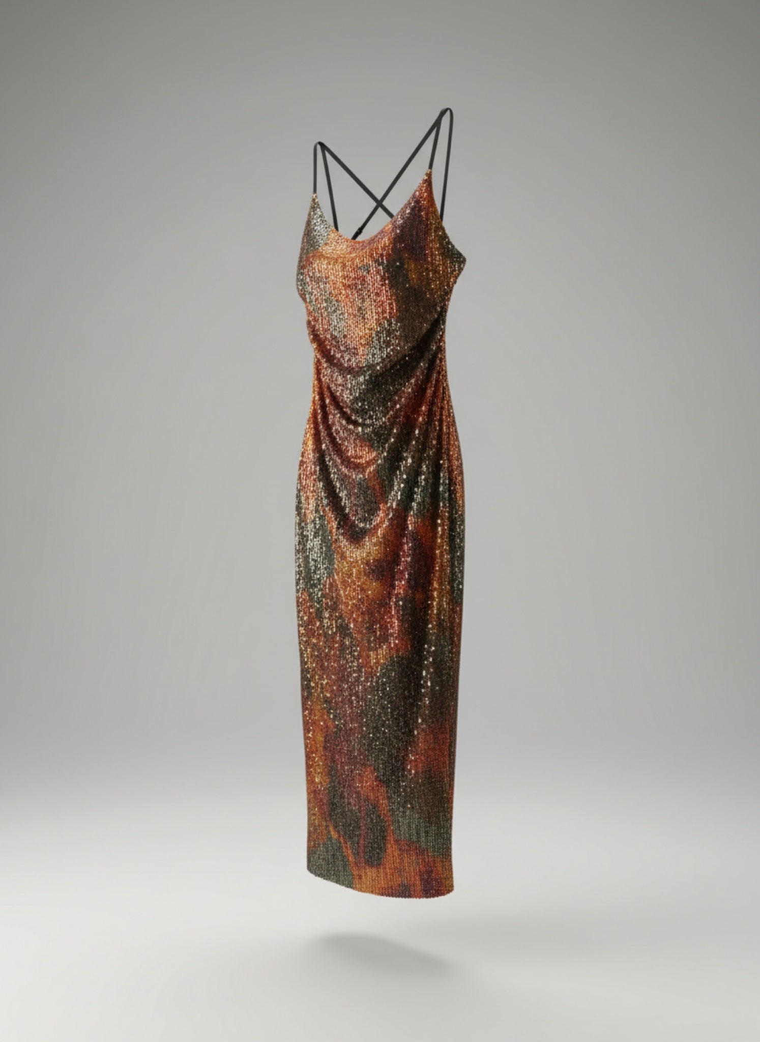 Abito donna longuette fino alle caviglie, completamente pagliettato, caratterizzato da una sofisticata palette ispirata ai colori del tramonto: marrone caldo, arancione intenso e verde militare. Un capo scenografico ed elegante, pensato per catturare lo sguardo con riflessi luminosi e giochi di luce.