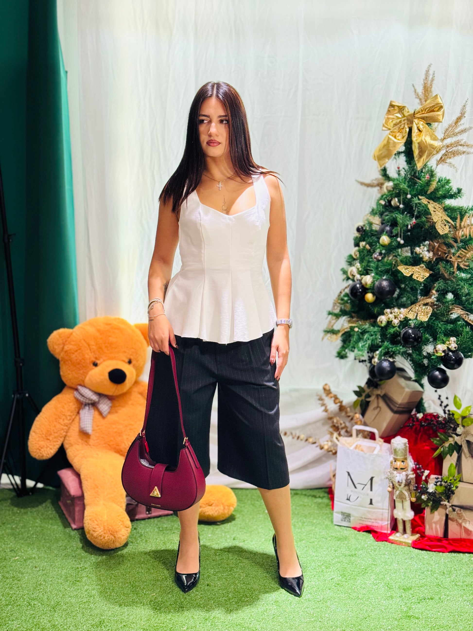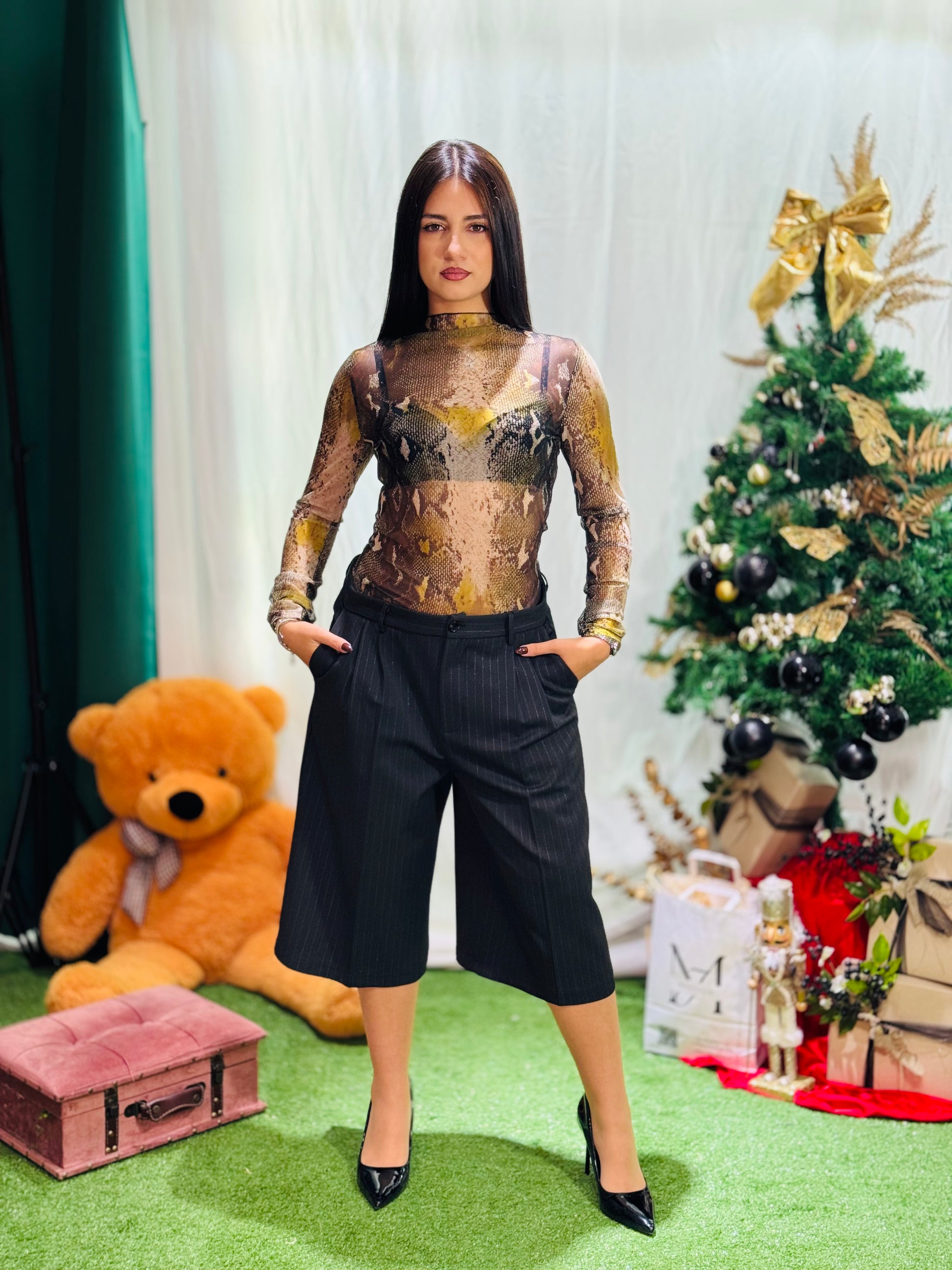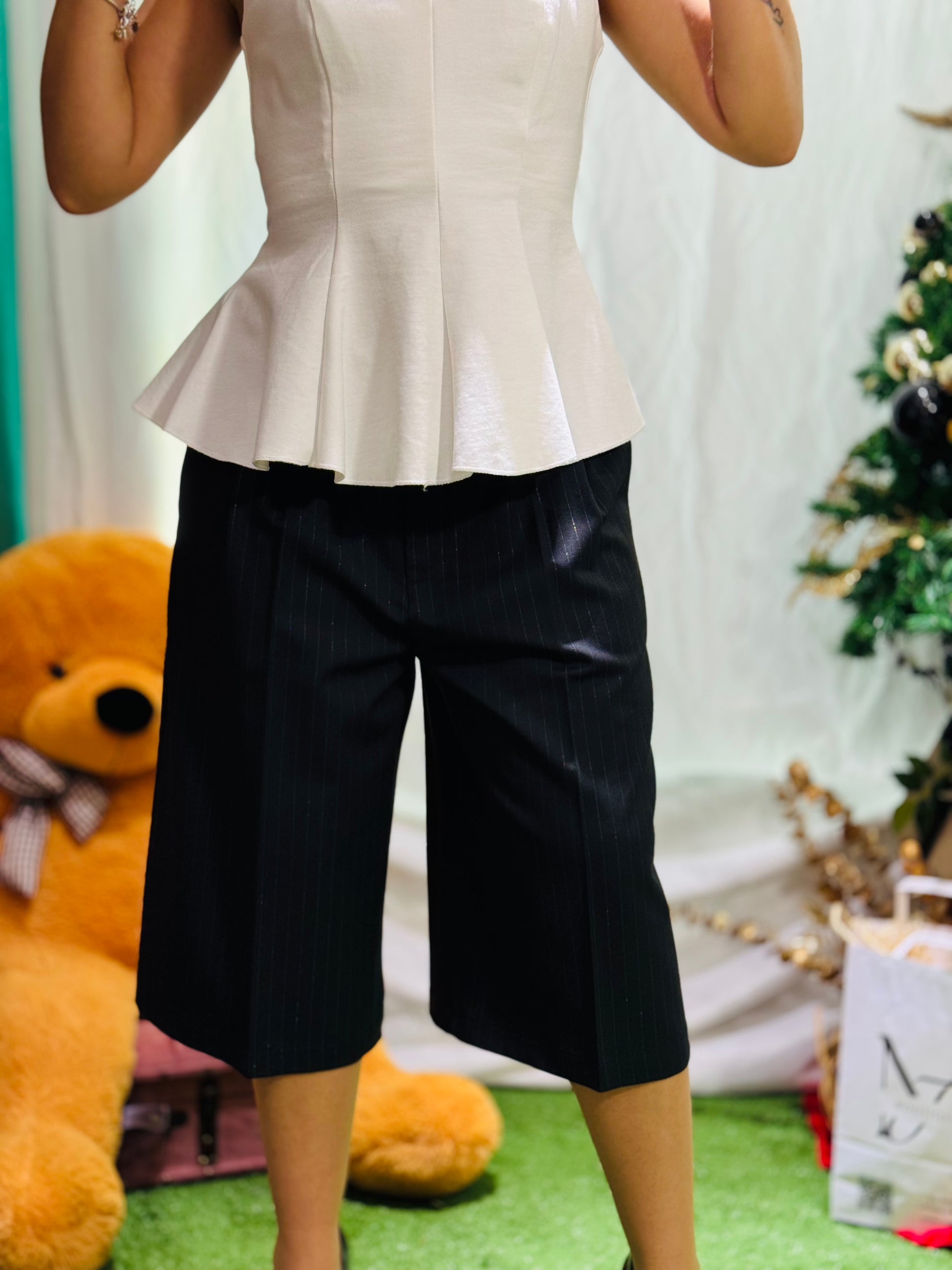 Bermuda eleganti a taglio sartoriale, realizzati in un tessuto strutturato ma confortevole che mantiene la forma senza segnare. La lunghezza appena sotto il ginocchio li rende perfetti sia per look casual-chic sia per outfit più raffinati. La vita medio-alta slancia la figura, mentre la gamba larga dona armonia e movimento.