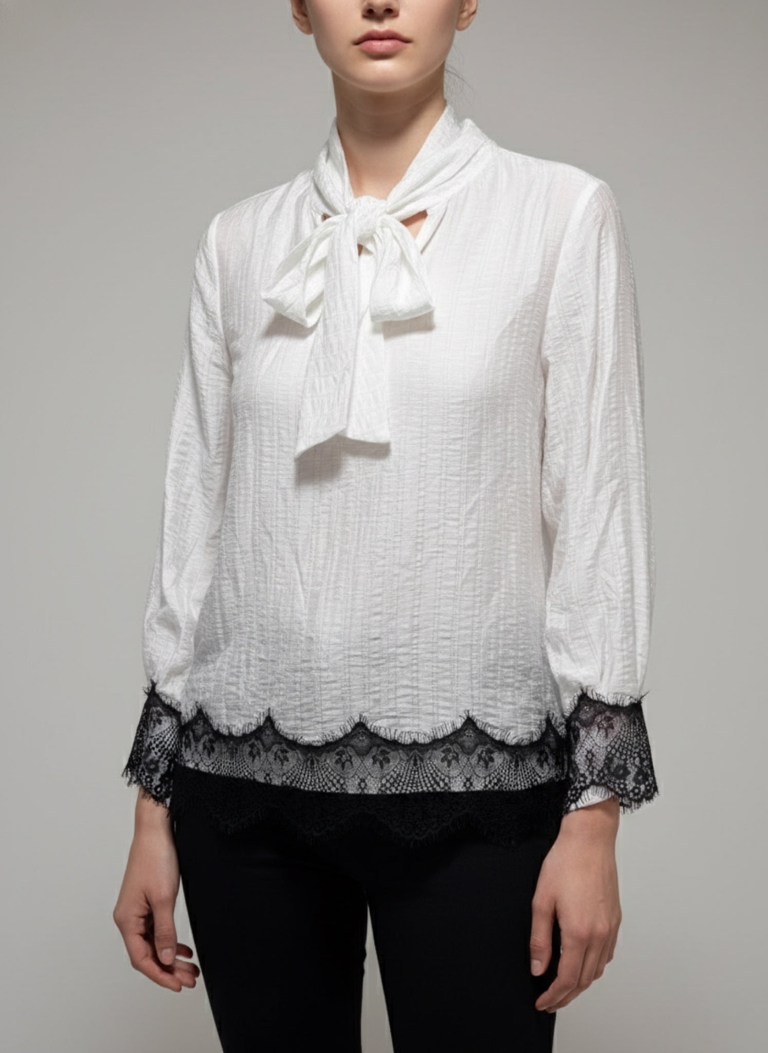 Blusa raffinata con fiocco al collo e dettagli in pizzo. Perfetta per look da ufficio o outfit eleganti.