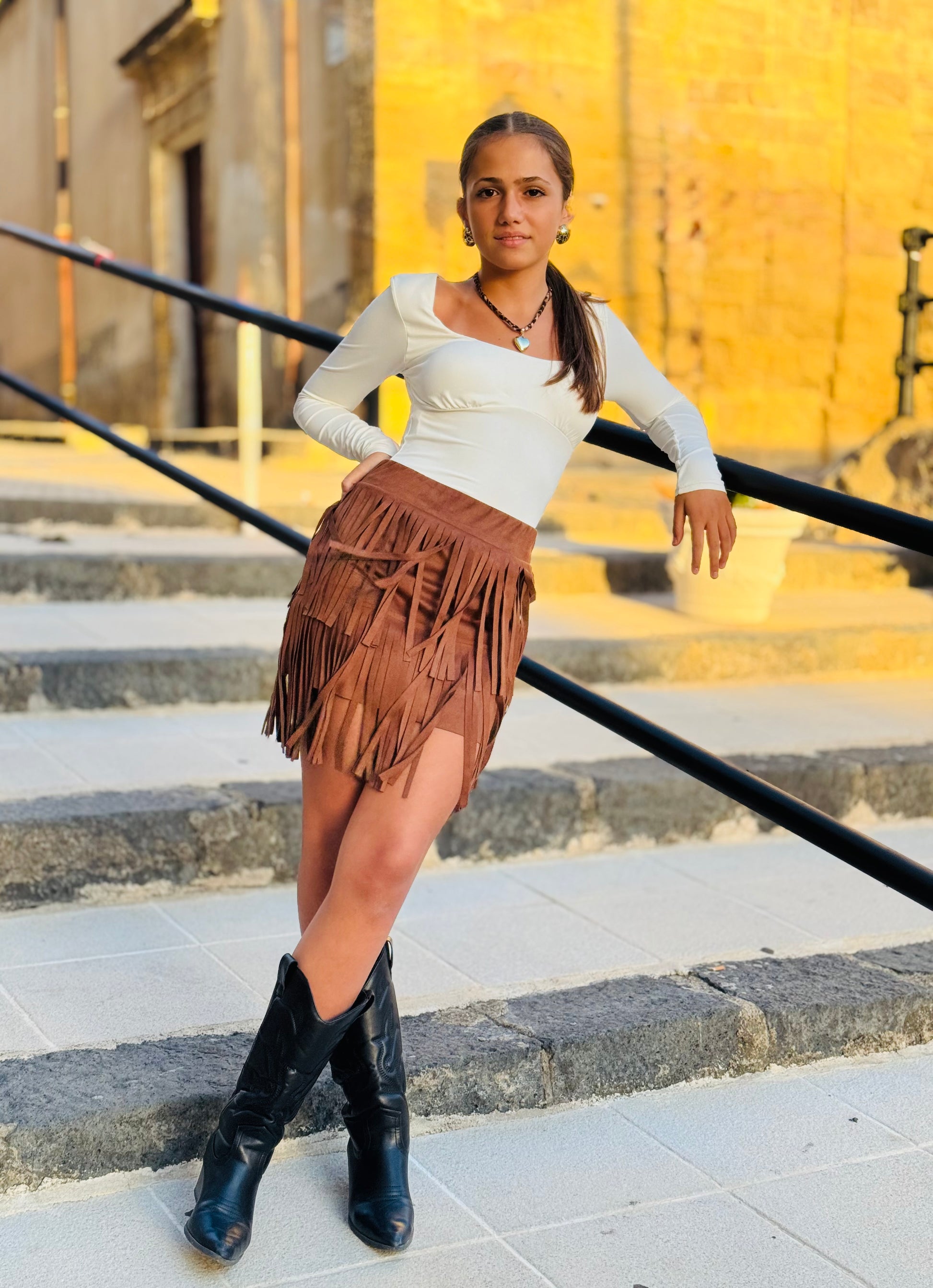 Il design con frange sovrapposte dona movimento e rende questa gonna ideale per outfit dallo stile boho, western e festival. Abbinala a un paio di stivali texani per un look country chic, oppure a una camicia o un top basic per un contrasto moderno.