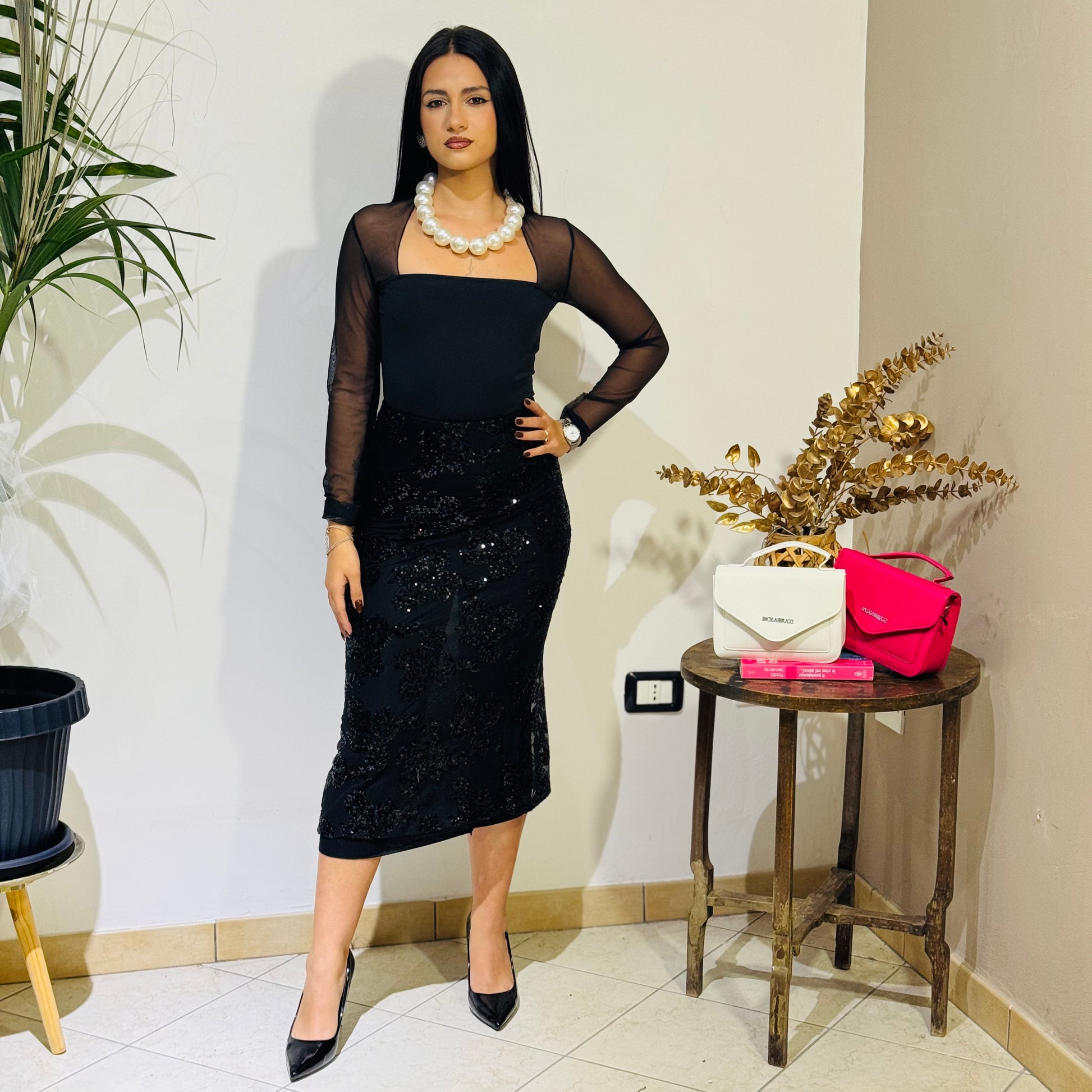 Gonna midi nera ricamata di paillettes tono su tono. Brilla con eleganza, senza esagerare. Modella, slancia e valorizza la silhouette. Effetto WOW garantito.