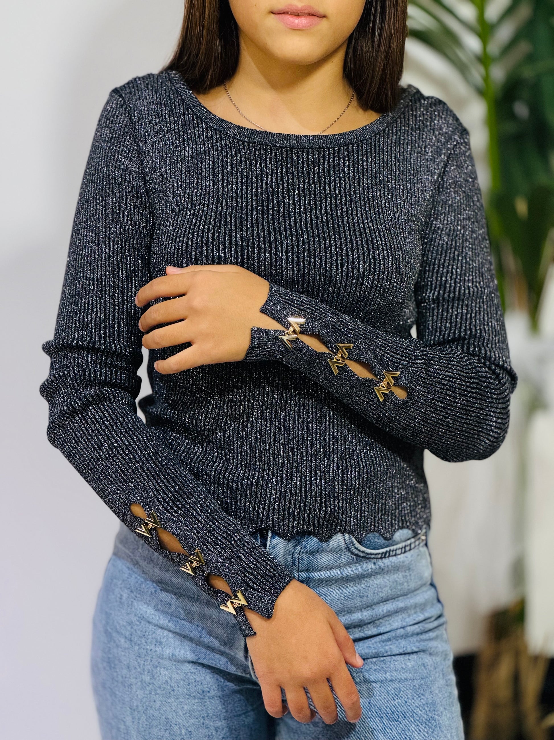 Il punto luce è tutto nelle maniche, arricchite da clip decorative e brillantini argento che rendono il capo perfetto sia per il giorno che per la sera.