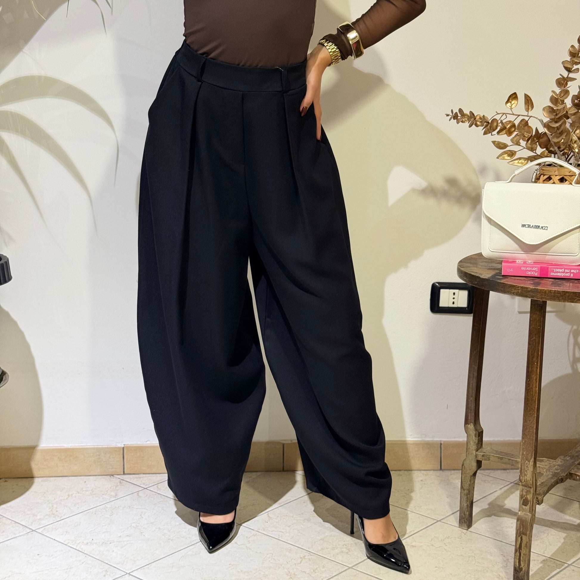 Pantalone dal taglio ampio e strutturato, con gamba molto larga che cade in modo morbido e slanciato.