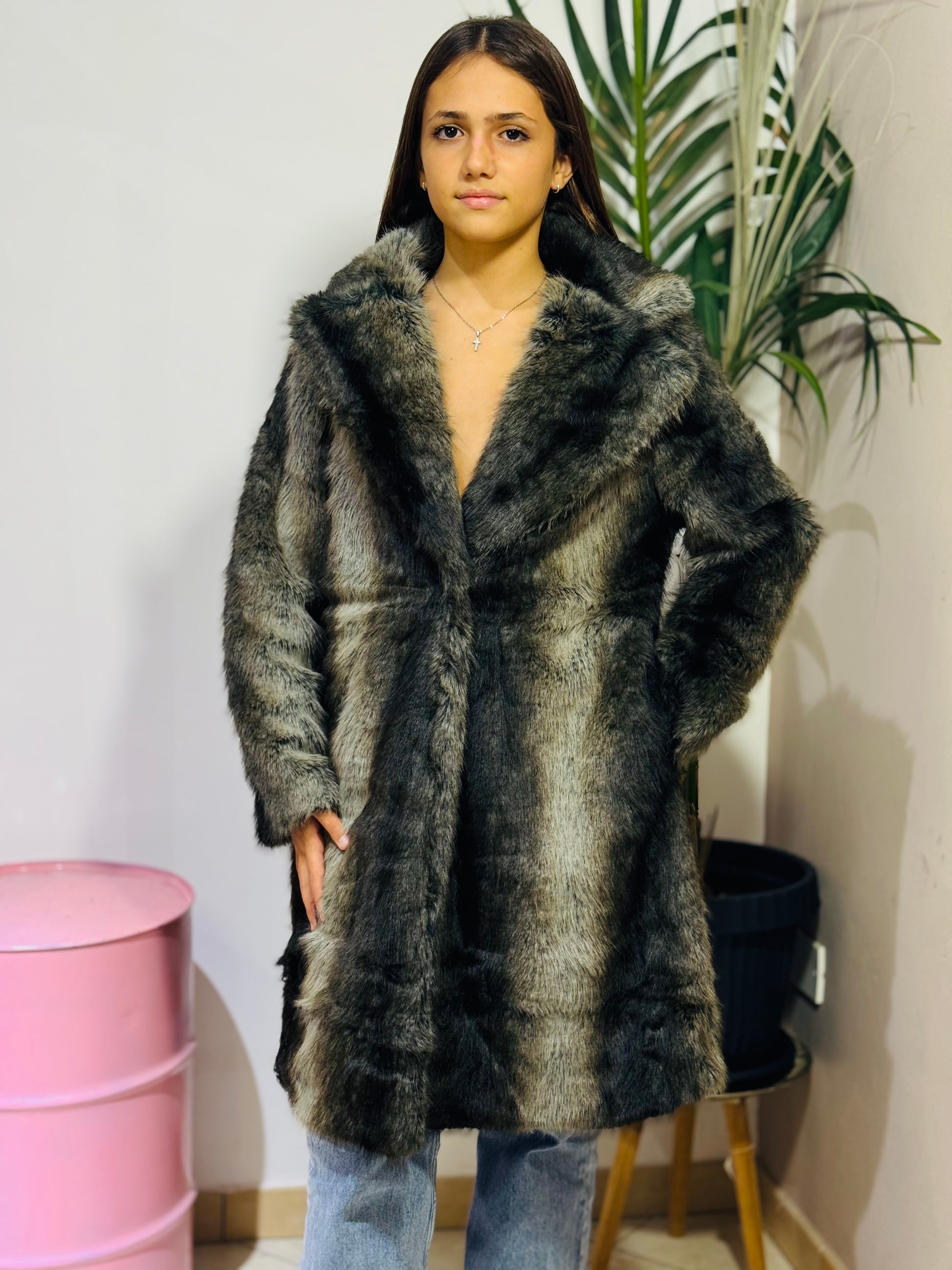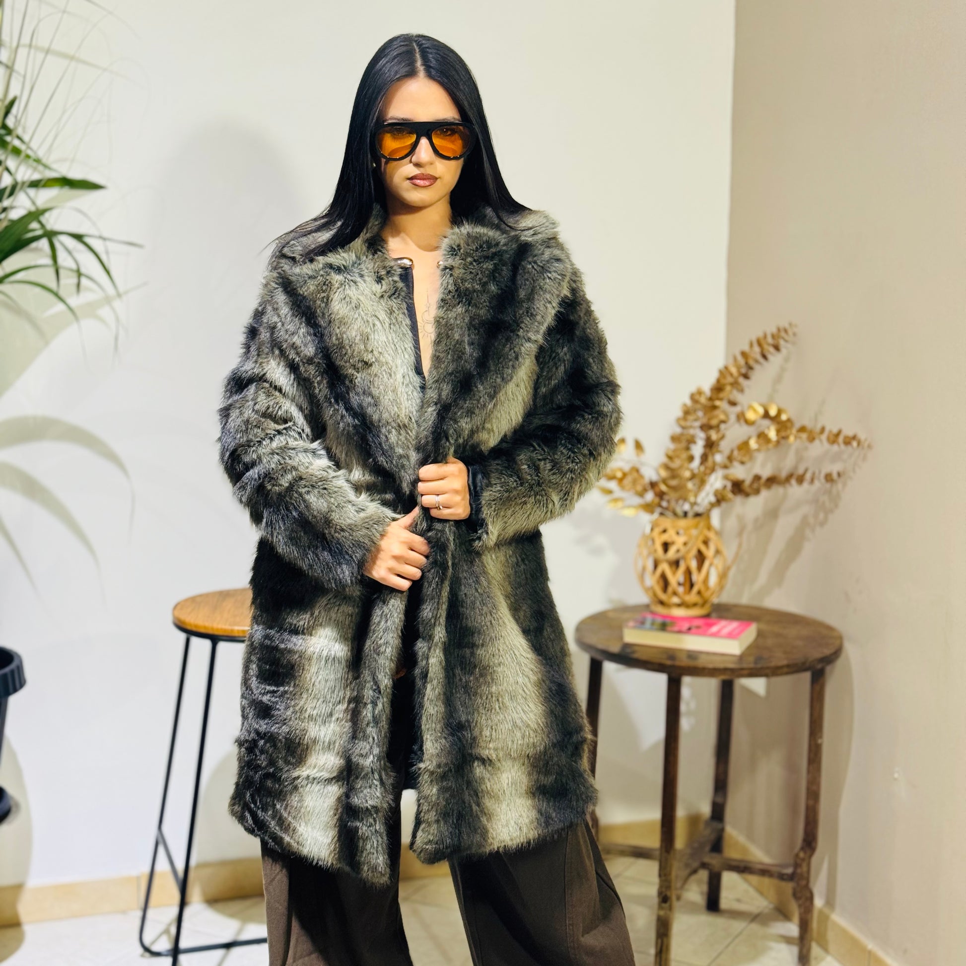 Una pelliccia ecologica soffice e calda, dal volume equilibrato che avvolge senza appesantire. Il colore sfumato dona profondità e un effetto visivo ricercato.