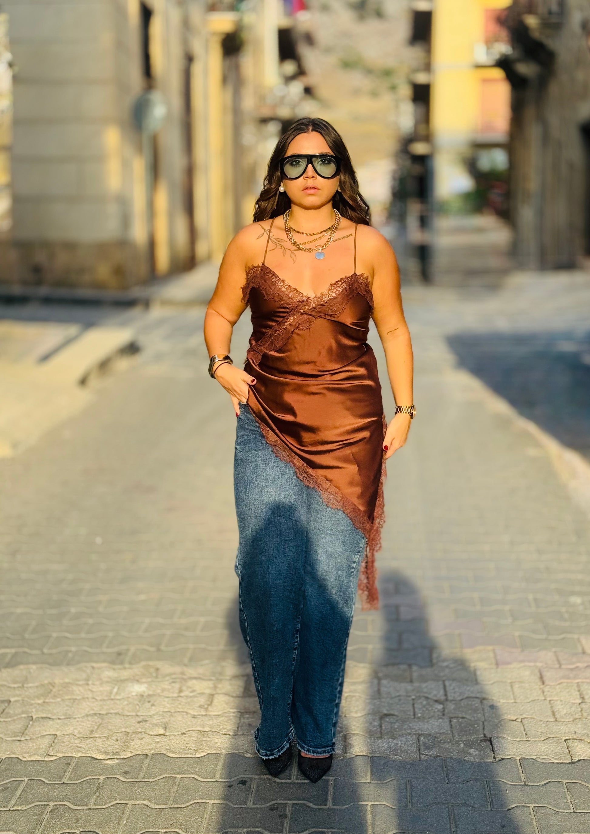 Elegante e versatile, questo top in raso con bretelline sottili è un must-have per chi desidera un look raffinato e senza tempo. Lo scollo a V esalta il décolleté con delicatezza, mentre la linea svasata sul fondo dona movimento e una vestibilità fluida che accarezza la silhouette senza segnarla.