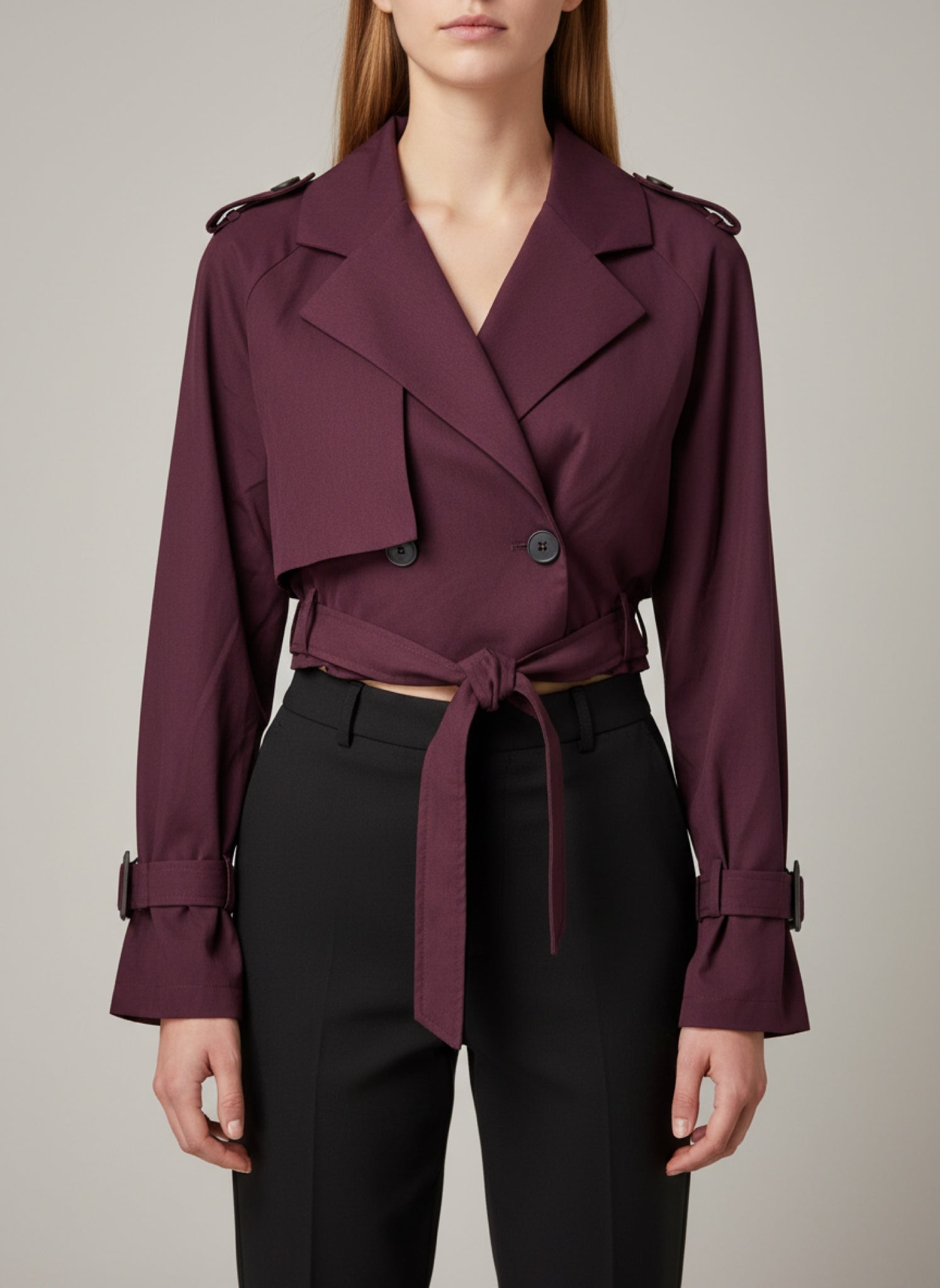 Trench donna crop dal design moderno e di tendenza, reinterpretazione contemporanea di un grande classico. La lunghezza corta valorizza la silhouette e rende il capo perfetto per outfit dinamici e urbani, ideali per la mezza stagione.